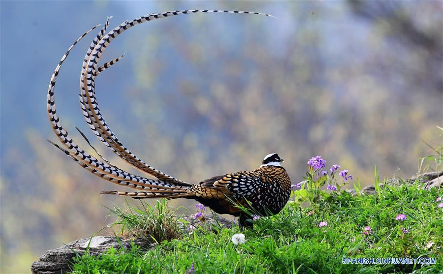 HUBEI, 1 abril, 2019 (Xinhua) -- Imagen del 28 de marzo de 2019 de un faisán venerado (syrmaticus reevesii) buscando comida sobre la ladera de una monta?a en Guangshui, en la provincia de Hubei, en el centro de China. El faisán venerado, un ave endémica de China, es una especie inscrita en la lista de clase II de especies protegidas del país. (Xinhua/Mei Yongcun)