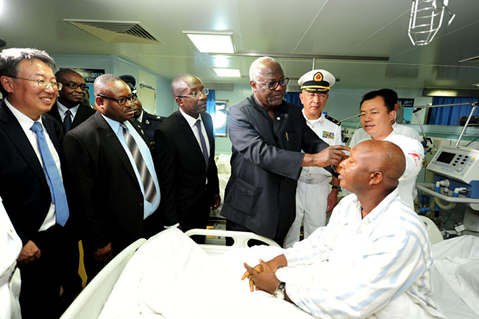El expresidente de Sierra Leona, Ernest Bai Koroma, descubre la gasa de un paciente operado de cataratas. Koroma visitó el Arca de la Paz, un buque hospital de la armada del Ejército Popular de Liberación de China (PLA, por sus siglas en inglés), el 25 de septiembre del 2017. Durante el encuentro, el presidente elogió los servicios médicos gratuitos ofrecidos a bordo a pacientes de Sierra Leona, y extendió su agradecimiento al personal médico del buque. (Foto: Pueblo en Línea)