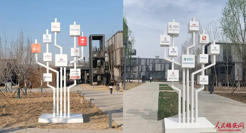 A principios de 2019, 26 empresas de alta tecnología se encontraban en la lista del área de oficinas corporativas del Centro de Servicios al Ciudadano de Xiong'an, y se establecieron sucesivamente sus oficinas. Los letreros en el parque indican que los tres principales operadores de telecomunicaciones de China, además de Alibaba, Tencent, Baidu, Eye Cool, Grupo 360 e instituciones financieras como ICBC y Sinopec Capital ya están en la lista. La imagen muestra un poste con los logotipos de empresas en el Centro de Servicios al Ciudadanos de Xiong'an. (Hu Yunong, Yan Li)