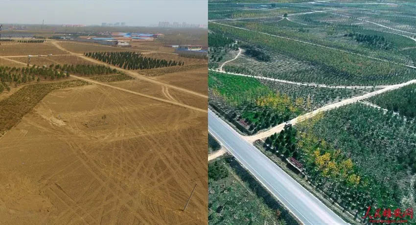 El 13 de noviembre de 2017, comenzaron a plantarse los árboles del "Bosque Milenario" en la parcela No. 9 del área Nueva de Xiong'an, con lo que se inauguró la construcción del proyecto “Bosque Milenario”. En la actualidad, el proyecto “Bosque Milenario” ha cubierto 110.000 mu con la plantación de 11 millones de árboles. En 2019, el área Nueva de Xiong'an cubrirá otros 200.000 mu de bosques. La tasa de cobertura forestal en el área nueva aumentará del 11% actual al 40%. La imagen muestra la parcela No. 9 donde se encuentra el “Bosque Milenario” antes y después de la plantación.