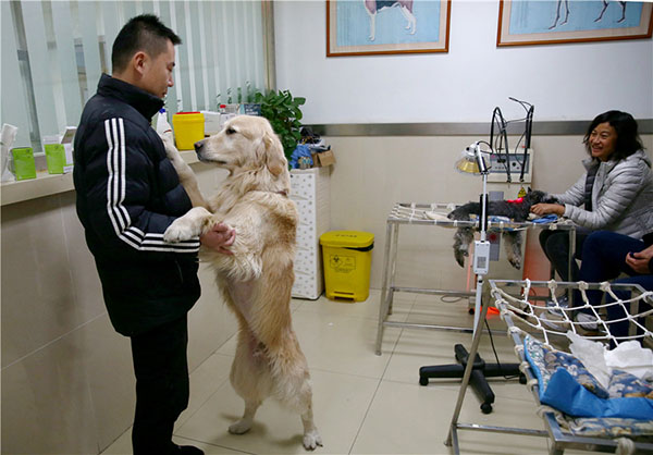 Los due?os de un Golden Retriever de 9 a?os de edad llevan a su mascota de Qingdao, provincia de Shandong, a Beijing para buscar tratamiento en el hospital. [Foto: Zou Hong/ China Daily]