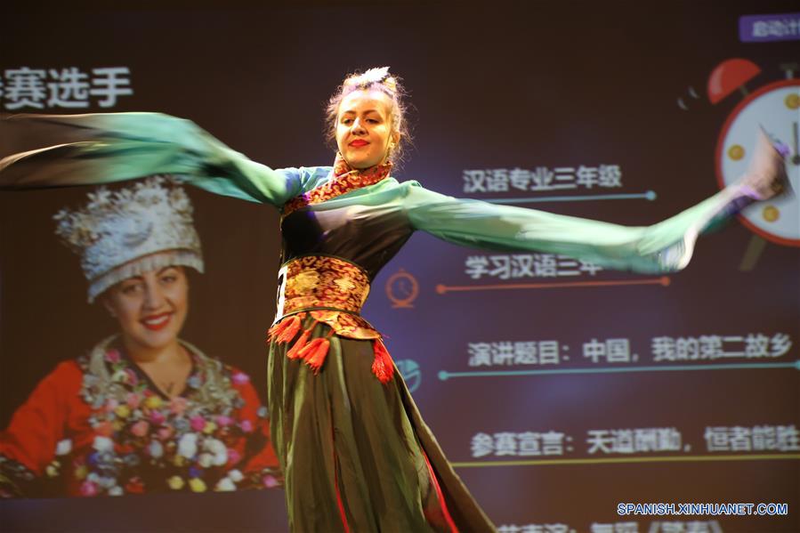 BUCAREST, 2 abril, 2019 (Xinhua) -- Paula Sorina, de la Universidad de Bucarest, realiza una presentación durante la competencia "Puente Chino", en Buarest, Rumania, el 2 de abril de 2019. De acuerdo con información de la prensa local, la edición 18 del "Puente Chino" de Rumania, una competencia anual china para estudiantes universitarios extranjeros, se llevó a cabo en Bucarest el martes, con Paula Sorina, de la Universidad de Bucarest, como la ganadora del Gran Premio. (Xinhua/Chen Jin)