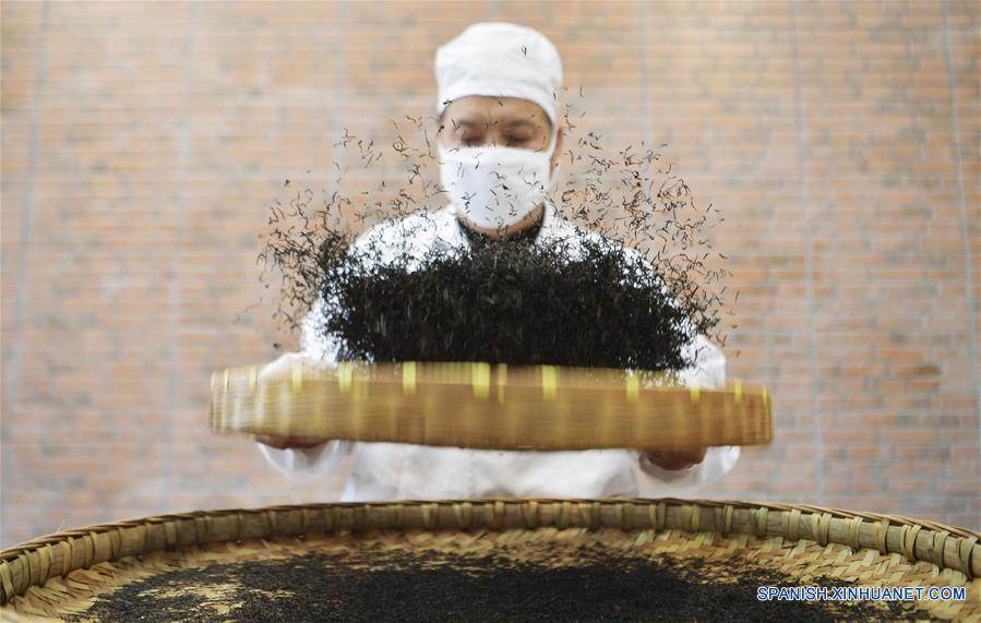 HUBEI, 7 abril, 2019 (Xinhua) -- Imagen del 6 de abril de 2019, del fabricante de té Qiu Jianhong secando hojas de té para hacer té negro de Lichuan, en la provincia de Hubei, en el centro de China. (Xinhua/Yang Shunpi)