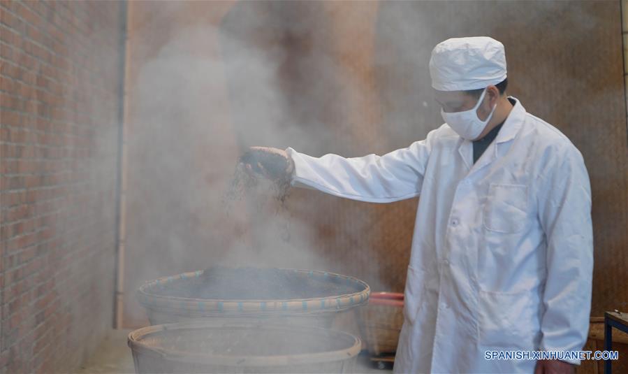 HUBEI, 7 abril, 2019 (Xinhua) -- Imagen del 6 de abril de 2019, del fabricante de té Qiu Jianhong fermentando hojas de té para hacer té negro de Lichuan, en la ciudad de Lichuan, en la provincia de Hubei, en el centro de China. (Xinhua/Yang Shunpi)