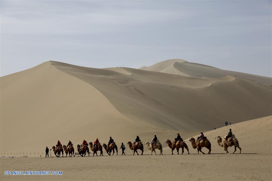 Turistas visitan la Monta?a Mingsha y el área escénica del Manantial de la Media Luna en el segundo día del feriado nacional del Festival Qingming de tres días de duración, en Dunhuang, provincia de Gansu, en el noroeste de China, el 6 de abril de 2019. (Xinhua/Zhang Xiaoliang)