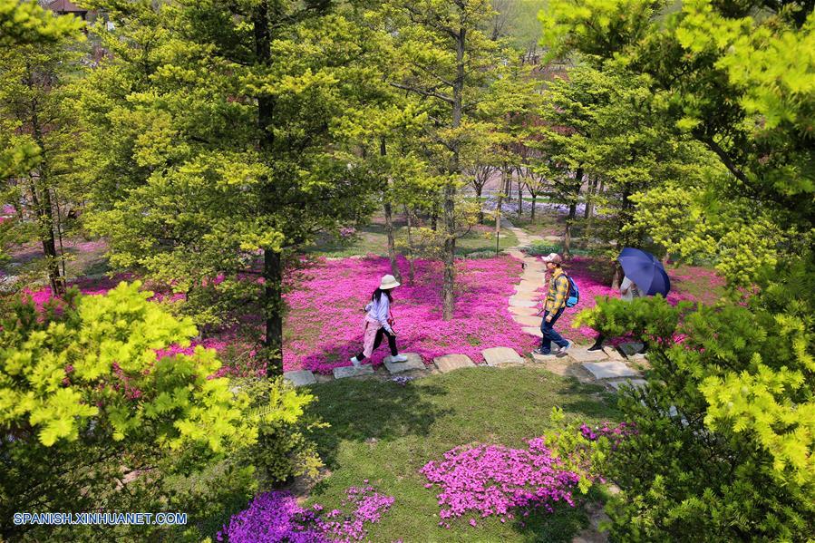 Imagen del 5 de abril de 2019 de turistas pasando el tiempo en el Jardín de Exposiciones Verdes Zhouji durante las vacaciones del Festival Qingming, en Nantong, provincia de Jiangsu, en el este de China. (Xinhua/Xu Congjun)