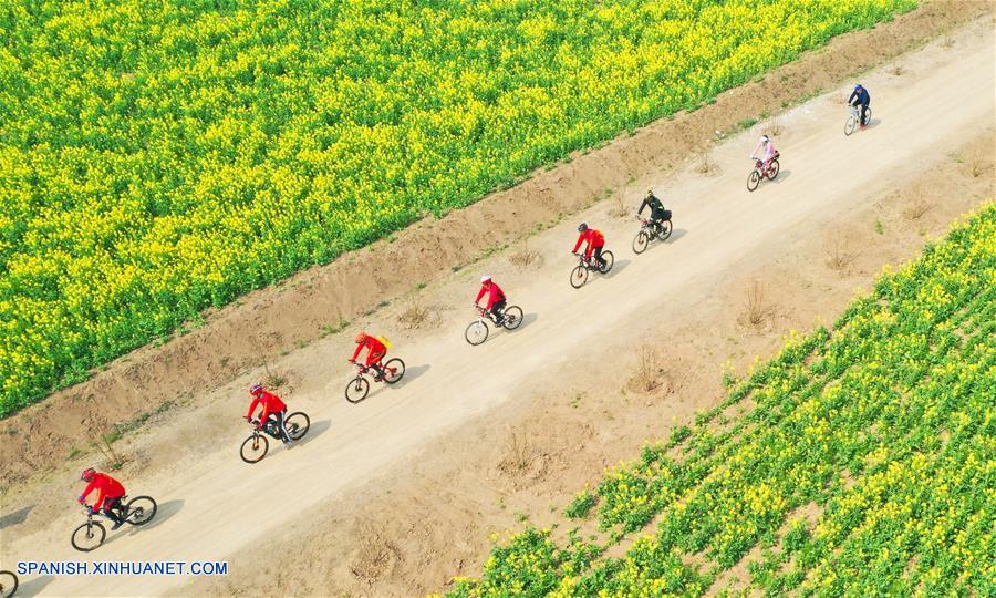 Imagen del 5 de abril de 2019 de turistas paseando en bicicleta para observar las flores durante las vacaciones del Festival Qingming, en la villa de Xiema de Bozhou, provincia de Anhui, en el este de China. (Xinhua/Zhang Yanlin)