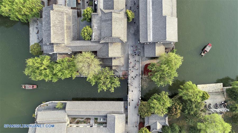 Imagen del 5 de abril de 2019 de una vista aérea de turistas tomando botes para observar el paisaje de la antigua localidad de Taierzhuang durante las vacaciones del Festival Qingming, en Zaozhuang, provincia de Shandong, en el este de China. (Xinhua/Gao Qimin)