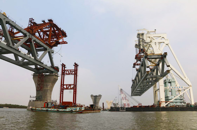 La construcción de la parte central del puente de Padma sobre el río Padma en Bangladesh está siendo realizada China Railway Major Bridge Engineering Group Co Ltd , el 21 de febrero de 2019. [Foto / Xinhua]