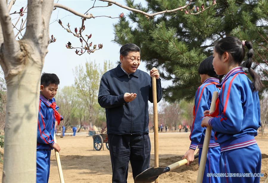 El presidente de China, Xi Jinping, también secretario general del Comité Central del Partido Comunista de China y presidente de la Comisión Militar Central, conversa con estudiantes durante una actividad de plantación de árboles, en el distrito de Tongzhou en Beijing, capital de China, el 8 de abril de 2019. Otros líderes del Partido y del Estado, entre ellos Li Zhanshu, Wang Yang, Wang Huning, Zhao Leji, Han Zheng y Wang Qishan, asistieron también a la actividad. (Xinhua/Ju Peng)