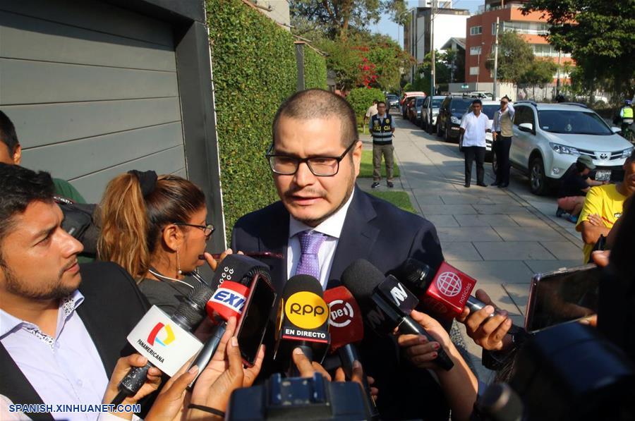 LIMA, 10 abril, 2019 (Xinhua) -- Imagen cedida por la Agencia Peruana de Noticias Andina, del abogado del ex presidente peruano, Pedro Pablo Kuczynski, Nelson Miranda (c), conversando con los representantes de los medios de comunicación frente a la residencia del ex mandatario, en Lima, Perú, el 10 de abril de 2019. La justicia peruana ordenó el miércoles la detención preliminar por 10 días del ex presidente Pedro Pablo Kuczynski (2016-2018), por la presunta comisión de lavado de activos en agravio del Estado. (Xinhua/Vidal Tarqui/ANDINA)
