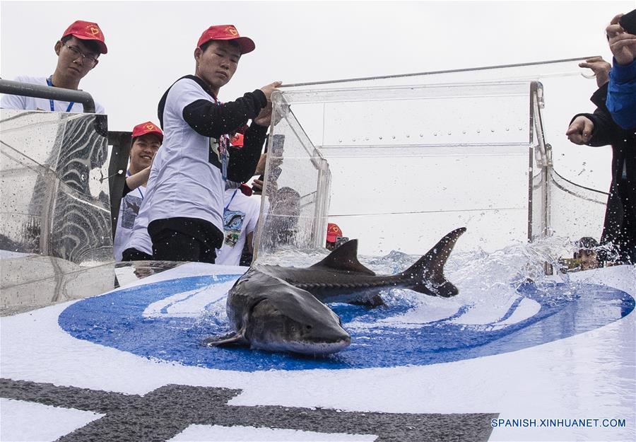 HUBEI, 13 abril, 2019 (Xinhua) -- La liberación del esturión chino es llevada a cabo en la sección de Yichang del río Amarillo, en la provincia de Hubei, en el centro de China, el 13 de abril de 2019. Un total de 700 esturiones chinos fueron liberados el sábado en el río más largo de China, el río Yangtse, para salvar esta especie de la extinción. Esta es la liberación número 61 por parte del Instituto de Investigación sobre el Esturión de la Corporación Tres Gargantas de China, que introdujo alrededor de 6 millones de esturiones a la naturaleza desde la década de 1980. El esturión chino, que se cree que vivió al mismo tiempo que los dinosaurios, ha existido durante más de 140 millones de a?os. El pez está bajo protección nacional de primer nivel. (Xinhua/Xiao Yijiu)