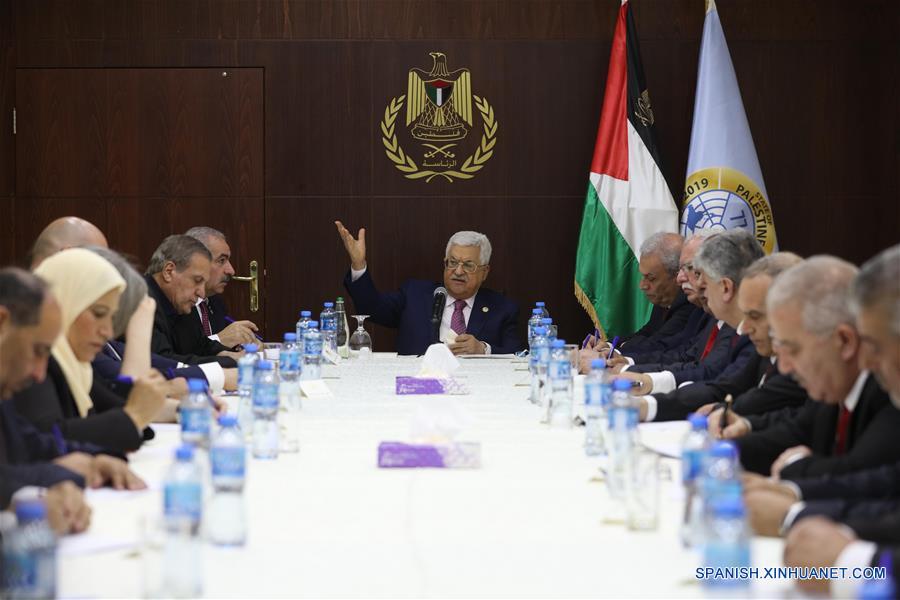 El presidente palestino, Mahmoud Abbas (c), reacciona durante su reunión con los miembros del nuevo gobierno después de la ceremonia de juramentación, en la ciudad cisjordana de Ramala, el 13 de abril de 2019. El primer ministro palestino, Mohammed Ishtaye, y los miembros de su gabinete fueron investidos el sábado ante el presidente Mahmoud Abbas en su oficina en la ciudad cisjordana de Ramala, informó la televisión oficial. (Xinhua/Pool/Fadi Arouri)
