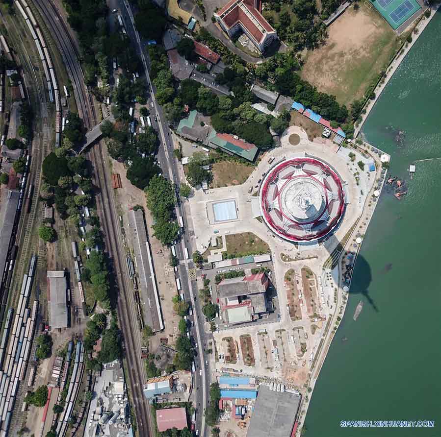 Imagen del 4 de abril de 2019 de una vista aérea de la Torre Loto, en Colombo, capital de Sri Lanka. Bajo la Iniciativa de la Franja y la Ruta, Sri Lanka y China firmaron el acuerdo de la Torre Loto en 2012 para costruir la torre de televisión más elevada de Asia del Sur, con China National Electronics Import and Export Corporation (CEIEC) siendo el contratista general. Para que la torre sea un éxito, tanto los trabajadores chinos como los locales han trabajado arduamente durante a?os. El proyecto será completado más adelante este a?o, y para entonces, la Torre Loto no sólo funcionará como una torre de televisión, sino también como hotel, centro comercial y centro de conferencias. (Xinhua/Guo Lei)