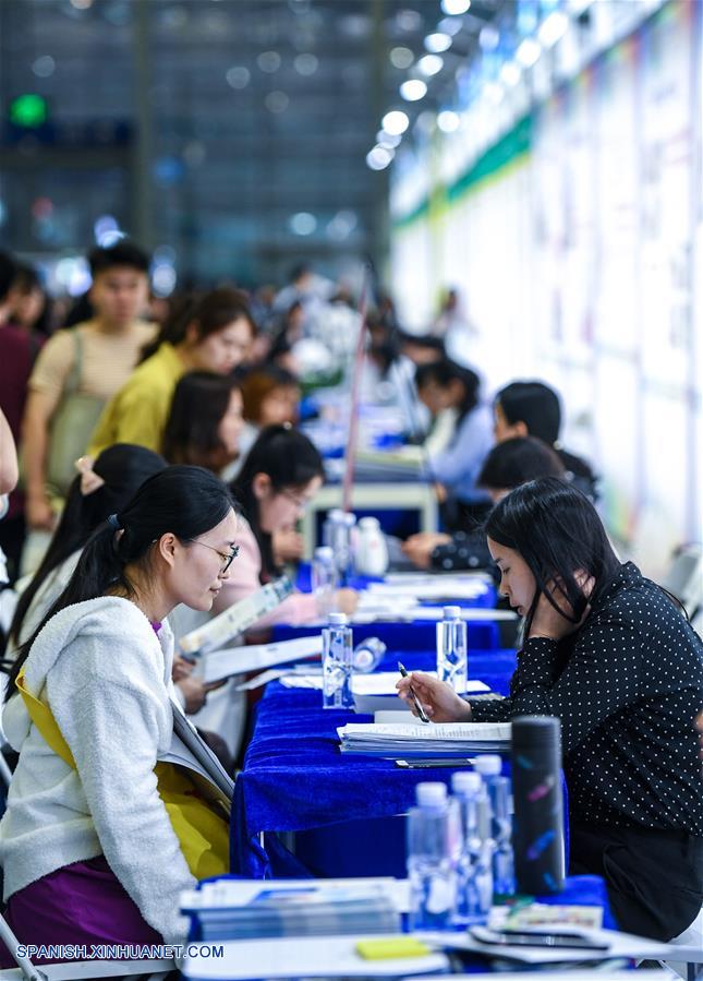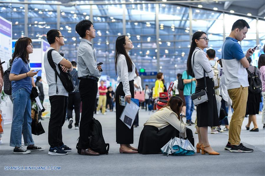 Solicitantes de empleo hablan con empleadores en una feria del empleo durante la 17 Conferencia sobre Intercambio Internacional de Profesionales (CIEP, por sus siglas en inglés), en Shenzhen, de la provincia de Guangdong, en el sur de China, el 14 de abril de 2019. La 17a Conferencia sobre Intercambio Internacional de Profesionales (CIEP) fue inaugurada el domingo en el centro tecnológico de Shenzhen, sur de China. (Xinhua/Mao Siqian)