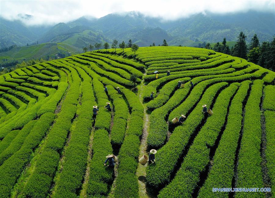 FUJIAN, 14 abril, 2019 (Xinhua) -- Vista aérea de agricultores de té recolectando hojas de té en un jardín ecológico de la villa de Chaoyang del municipio Xingcun, Wuyishan, en la provincia de Fujian, en el sureste de China, el 14 de abril de 2019. La villa Chaoyang del municipio de Xingcun celebró el domingo un evento de cultura popular tradicional, orando por la cosecha del té. (Xinhua/Wei Peiquan)