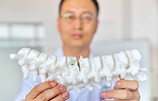 Un médico muestra el modelo vertebral torácico impreso en 3D de uno de sus pacientes. [Foto por Cao Jianxiong / Para China Daily]