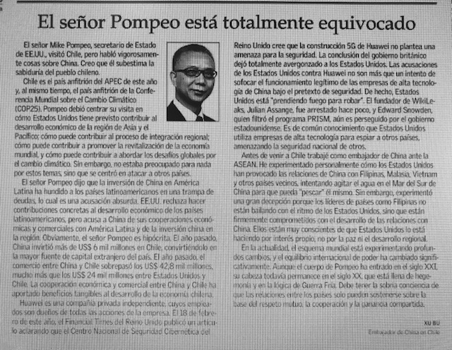 Xu Bu, embajador de China en Chile, escribe un artículo en "El mercurio" de Chile refutando las acusaciones de Pompeo contra China