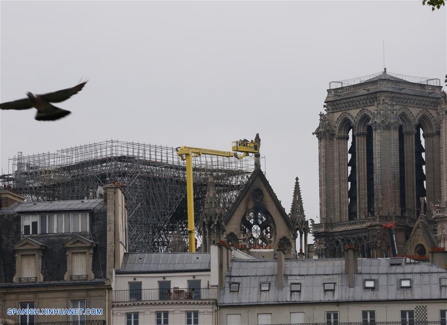 PARIS, 16 abril, 2019 (Xinhua) -- Trabajadores laboran en la da?ada catedral de Notre Dame después de un incendio, en París, Francia, el 16 de abril de 2019. El presidente de Francia, Emmanuel Macron, prometió el lunes reconstruir la catedral de Notre Dame, devastada por un incendio, en un lapso de cinco a?os e hizo un llamado a los franceses para que permanezcan unidos. (Xinhua/Gao Jing)