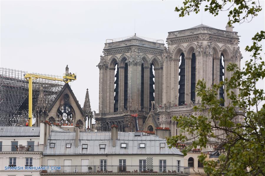 PARIS, 16 abril, 2019 (Xinhua) -- Trabajadores laboran en la da?ada catedral de Notre Dame después de un incendio registrado, en París, Francia, el 16 de abril de 2019. El presidente de Francia, Emmanuel Macron, prometió el lunes reconstruir la catedral de Notre Dame, devastada por un incendio, en un lapso de cinco a?os e hizo un llamado a los franceses para que permanezcan unidos. (Xinhua/Gao Jing)