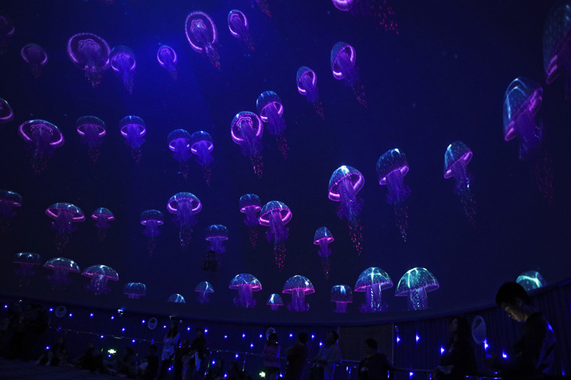Los visitantes aprecian el mundo submarino virtual en el cine del Parque Oceánico Haichang, Shanghai, 15 de abril del 2019. [Foto: IC]