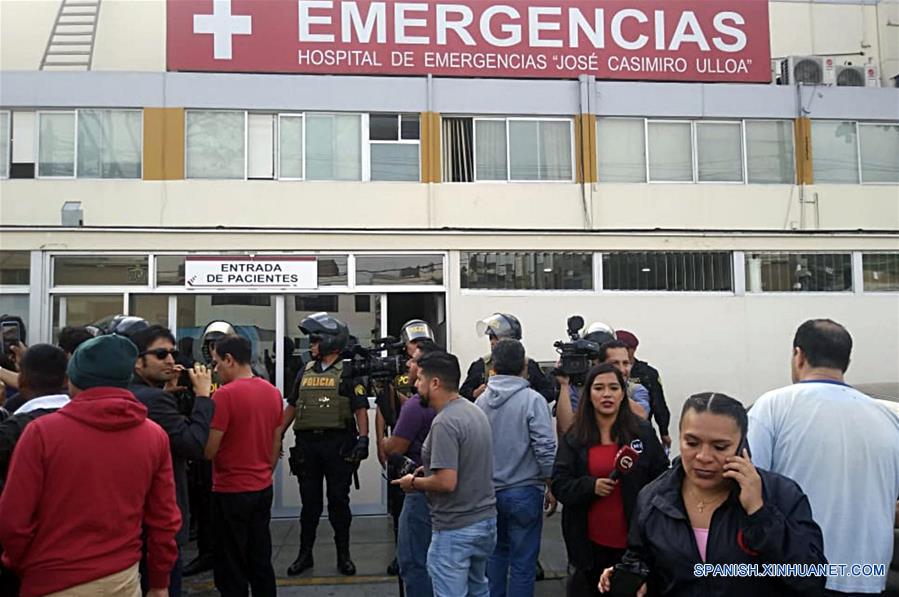 Imagen cedida por la Agencia Peruana de Noticias Andina de personas reuniéndose frente al Hospital Nacional Casimiro Ulloa donde fue internado de emergencia el ex presidente peruano Alan García, en el distrito de Miraflores, provincia de Lima, Perú, el 17 de abril de 2019. El presidente de Perú, Martín Vizcarra, afirmó el miércoles estar "consternado" por la muerte del ex mandatario Alan García (1985-1990 / 2006-2011), luego de haberse pegado un tiro en la cabeza para evitar su detención por el caso de corrupción de la constructora brasile?a Odebrecht. (Xinhua/Vidal Tarqui/ANDINA)