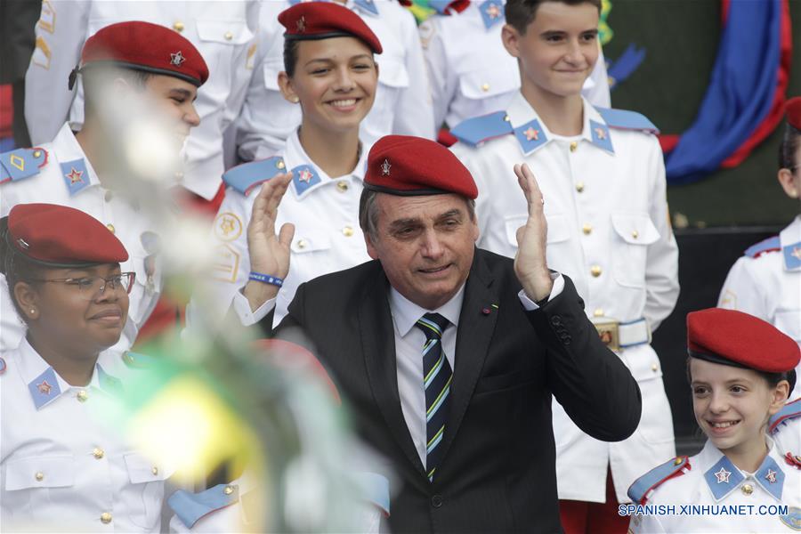 El presidente brasile?o, Jair Bolsonaro (c-abajo), posa durante una ceremonia en conmemoración del Día del Ejército, en Brasilia, Brasil, el 17 de abril de 2019. De acuerdo con información de la prensa local, Bolsonaro expresó su deseo de que todas las escuelas en el país sean iguales a las del Ejército, durante la ceremonia en la que se llevó a cabo un desfile de las fuerzas castrenses así como de estudiantes de colegios militares. (Xinhua/Lucio Tavora)