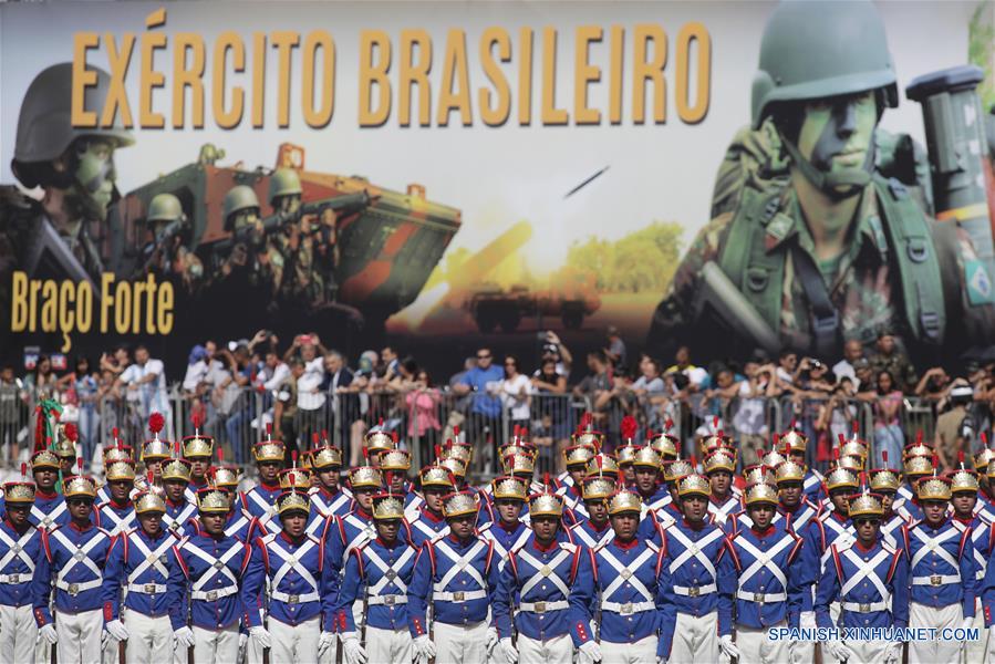 Soldados del batallón de guardias presidenciales participan en un desfile durante una ceremonia en conmemoración del Día del Ejército, en Brasilia, Brasil, el 17 de abril de 2019. De acuerdo con información de la prensa local, Bolsonaro expresó su deseo de que todas las escuelas en el país sean iguales a las del Ejército, durante la ceremonia en la que se llevó a cabo un desfile de las fuerzas castrenses así como de estudiantes de colegios militares. (Xinhua/Lucio Tavora)