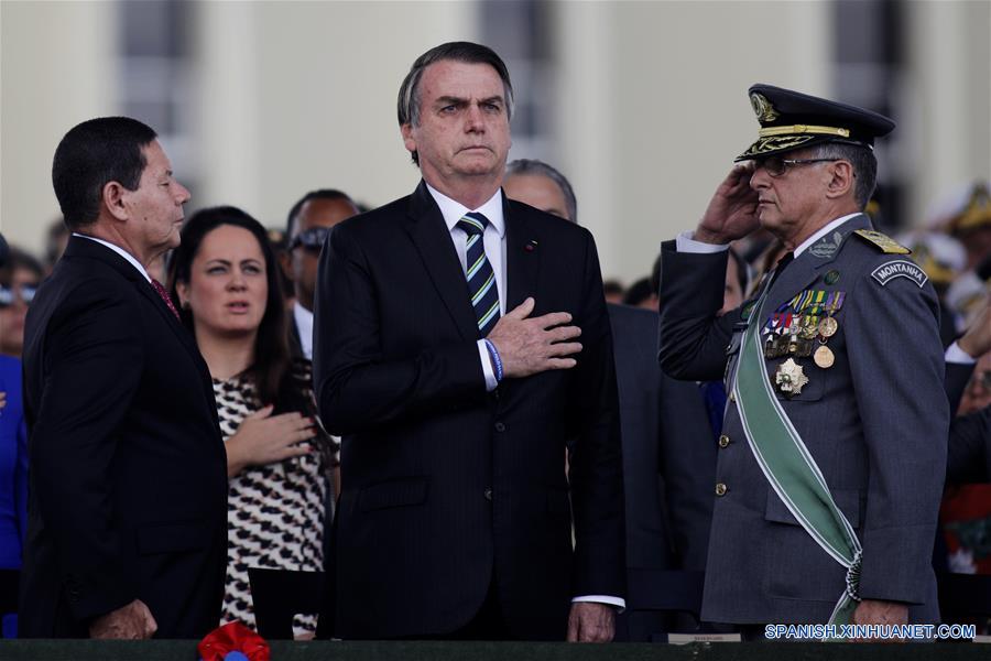 El presidente brasile?o, Jair Bolsonaro (c-frente), el vicepresidente de Brasil, Hamilton Mourao (i-frente), y el comandante del Ejército, el general Edson Leal Pujol (d-frente), asisten a una ceremonia en conmemoración del Día del Ejército, en Brasilia, Brasil, el 17 de abril de 2019. De acuerdo con información de la prensa local, Bolsonaro expresó su deseo de que todas las escuelas en el país sean iguales a las del Ejército, durante la ceremonia en la que se llevó a cabo un desfile de las fuerzas castrenses así como de estudiantes de colegios militares. (Xinhua/Lucio Tavora)