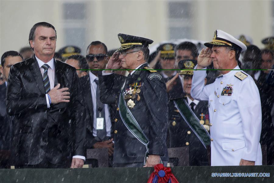 El presidente brasile?o, Jair Bolsonaro (i-frente), y el comandante del Ejército, el general Edson Leal Pujol (c-frente), asisten a una ceremonia en conmemoración del Día del Ejército, en Brasilia, Brasil, el 17 de abril de 2019. De acuerdo con información de la prensa local, Bolsonaro expresó su deseo de que todas las escuelas en el país sean iguales a las del Ejército, durante la ceremonia en la que se llevó a cabo un desfile de las fuerzas castrenses así como de estudiantes de colegios militares. (Xinhua/Lucio Tavora)