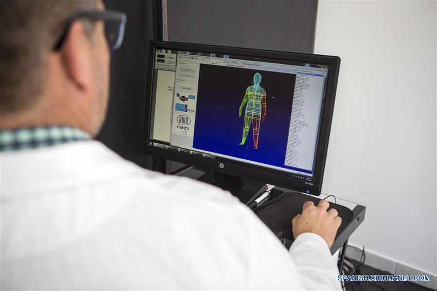 BUENOS AIRES, 17 abril, 2019 (Xinhua) -- Paulo Tompson, responsable técnico del equipo y asistente en las tareas del estudio antropométrico nacional, observa las mediciones de un escaneo, en el área "Textiles" del Instituto Nacional de Tecnología Industrial (INTI), en Buenos Aires, Argentina, el 17 de abril de 2019. Expertos de Argentina realizan un estudio antropométrico nacional, el primero en su tipo con esa amplitud, para determinar las dimensiones del cuerpo de la población del país según sexo, edad y región, y poder así elaborar una escala de talles adecuada. (Xinhua/Martín Zabala)
