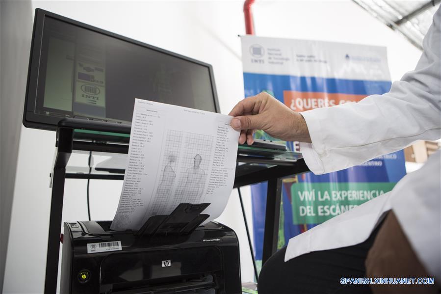 BUENOS AIRES, 17 abril, 2019 (Xinhua) -- Paulo Tompson, responsable técnico del equipo y asistente en las tareas del estudio antropométrico nacional, retira una impresión con los datos de un escaneo, en el área "Textiles" del Instituto Nacional de Tecnología Industrial (INTI), en Buenos Aires, Argentina, el 17 de abril de 2019. Expertos de Argentina realizan un estudio antropométrico nacional, el primero en su tipo con esa amplitud, para determinar las dimensiones del cuerpo de la población del país según sexo, edad y región, y poder así elaborar una escala de talles adecuada. (Xinhua/Martín Zabala)
