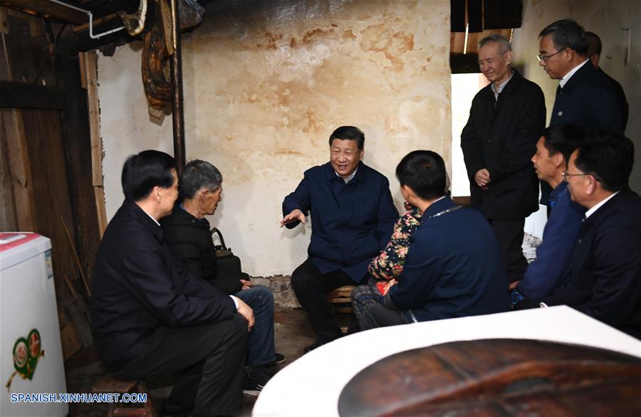 El presidente chino, Xi Jinping, también secretario general del Comité Central del Partido Comunista de China y presidente de la Comisión Militar Central, visita la casa de una aldeana para conocer el progreso de la reducción de la pobreza y de la resolución de problemas destacados incluyendo el cumplimiento de las necesidades básicas de alimentos y ropa y la garantización de la educación obligatoria, la atención médica básica y la vivienda segura, en la aldea de Huaxi del distrito autónomo de la etnia tujia de Shizhu, en Chongqing, en el suroeste de China, el 15 de abril de 2019. Xi realizó el lunes una visita de inspección a la municipalidad de Chongqing, en el suroeste de China. (Xinhua/Xie Huanchi)