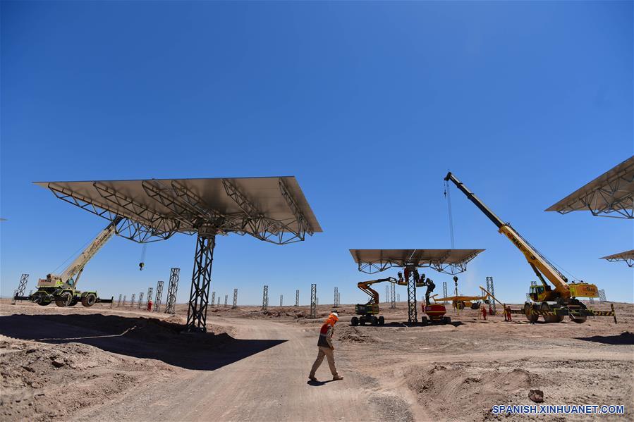 Imagen del 26 de marzo de 2019, de personas laborando en el complejo solar Cerro Dominador, en Sierra Gorda, en la región de Antofagasta, Chile. En Sierra Gorda, en el desierto chileno de Atacama, donde está el nivel más alto de radiación solar en la Tierra, se construye el complejo solar Cerro Dominador, la primera planta termosolar de América Latina que producirá energía las 24 horas del día. (Xinhua/Jorge Villegas)