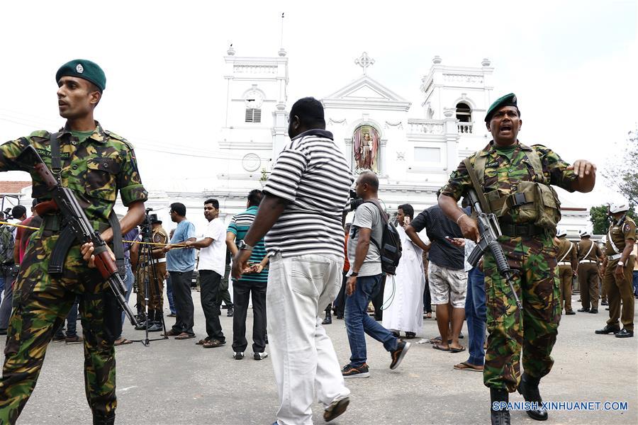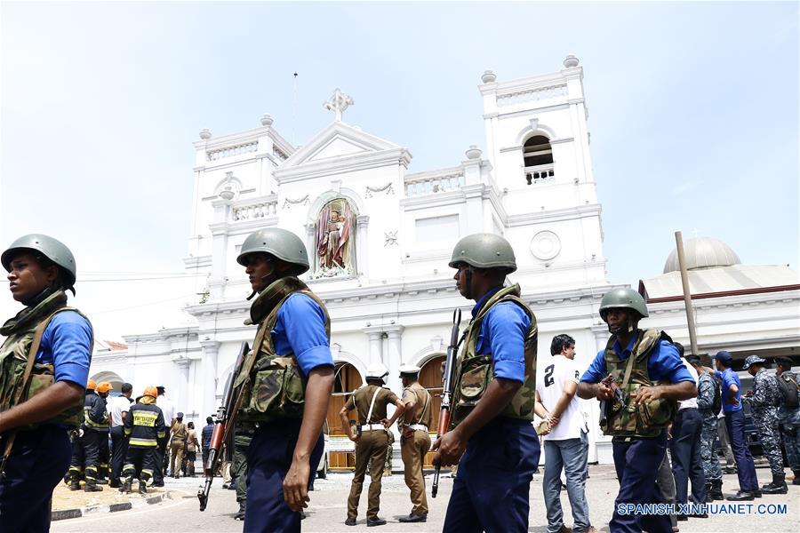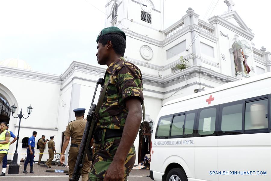 Fuerzas de seguridad montan guardia frente a la Iglesia de San Antonio donde se produjo una explosión en Colombo, Sri Lanka, el 21 de abril de 2019. Tras las múltiples explosiones que sacudieron el domingo distintos puntos de Sri Lanka dejando 192 muertos y más de 470 heridos, el Gobierno ha impuesto un toque de queda nacional, dijeron las autoridades locales. En total, ocho explosiones han azotado el país hasta el momento, seis de ellas registradas por la ma?ana y dos por la tarde. El toque de queda se ha impuesto desde las 18:00 del domingo hasta las 06:00 hora local del lunes.(Xinhua/A.Hapuarachchi)