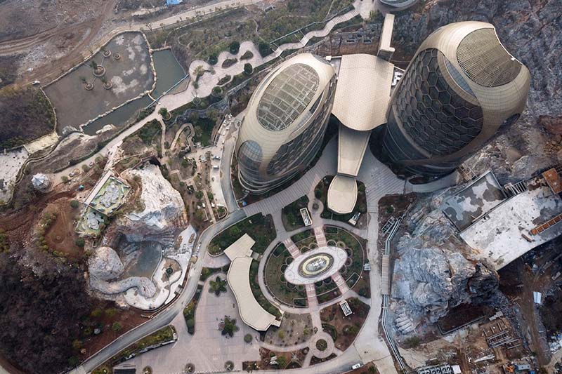 Nanjing,23/04/2019(El Pueblo en Línea) - Hotel construido en Nanjing, provincia de Jiangsu, que recuerda la "base alienígena" de algunos filmes de ficción. El nuevo hotel, que ocupa una superficie de 105.000 metros cuadrados, está construido junto a un acantilado en la zona monta?osa Laoshan, en Nanjing. De acuerdo a su inspiración gráfica, este hotel fue bautizado como “nido de abejas”, 22 de abril del 2019 [Foto: IC]