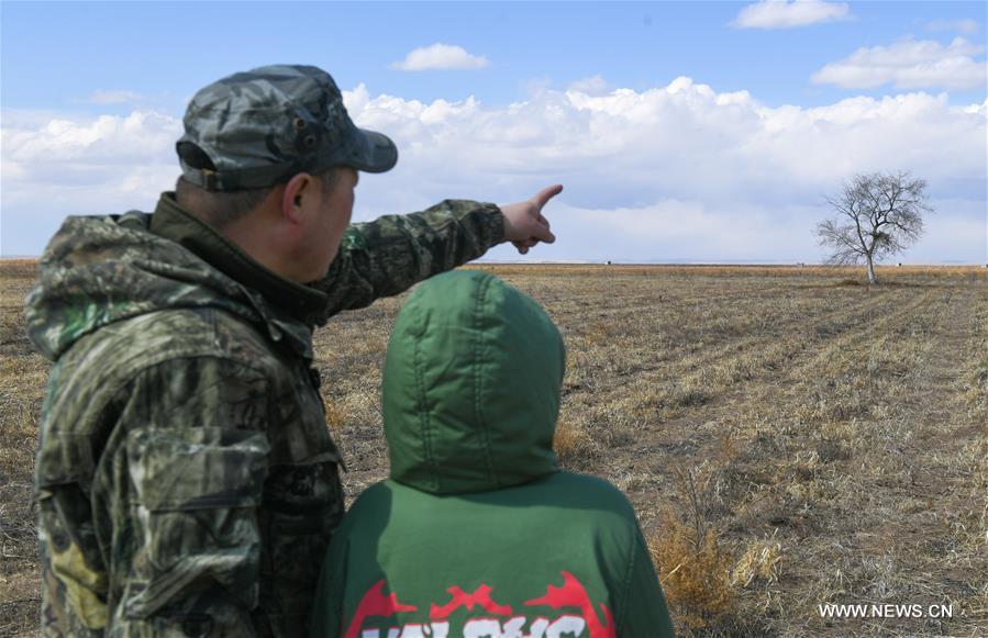 Beijing, 24/04/2019 (El Pueblo en Línea) - Shuanglong, de la etnia mongola, y su hijo observan un recién construido nido de buitre en las tierras altas camino hacia el Lago Hulun, en Hulun Buir, Región Autónoma de Mongolia Interior, 13 de abril del 2019. Shuanglong, nacido en la década de 1980, es un voluntario que se ha dedicado durante los últimos diez a?os a proteger la vida silvestre en el entorno del Lago Hulun. Gracias a sus esfuerzos, se han podido salvar más de 40 animales en peligro de extinción. Como formas de concientizar a los residentes sobre la protección de la vida silvestre, el infatigable activista ha organizado diversas actividades, incluyendo exposiciones fotográficas y charlas. Motivados por su ejemplo, nuevos voluntarios también han unido a las acciones de protección de la vida silvestre en el entorno del Lago Hulun. (Foto: Xinhua/ Peng Yuan)