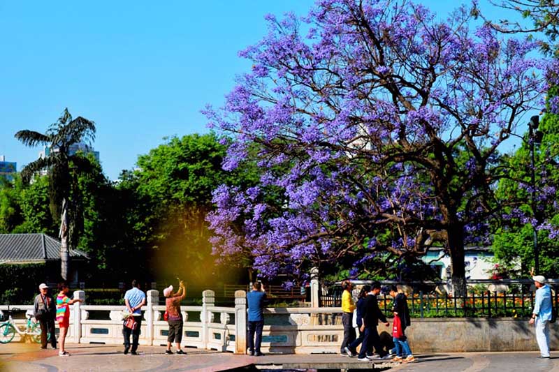 La gente pasea y hace fotos a las jacarandas azules en flor en la ciudad de Kunming en la provincia de Yunnan, suroeste de China, cada abril. [Foto por Xie Quanming / proporcionada a chinadaily.com.cn]