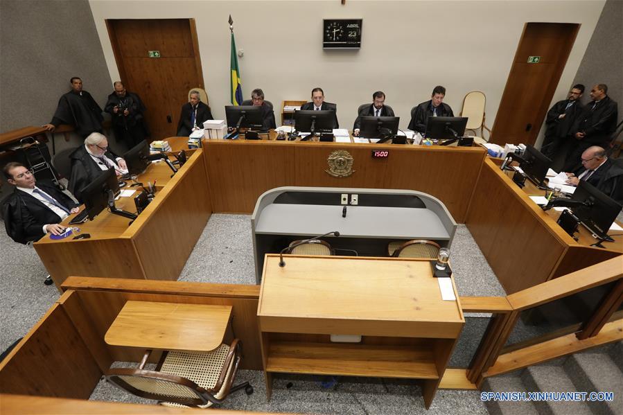 El juez relator del Superior Tribunal de Justicia (STJ) de Brasil, Felix Fischer (2-i), participa en la revisión de sentencia del ex presidente de Brasil Luiz Inácio Lula da Silva, en Brasilia, Brasil, el 23 de abril de 2019. El juez relator Felix Fischer, del STJ de Brasil, propuso el martes en su voto reducir la condena del ex presidente Luiz Inácio Lula da Silva, preso en Curitiba, de 12 a?os y un mes de prisión a ocho a?os y 10 meses de prisión. (Xinhua/Lucio Tavora)