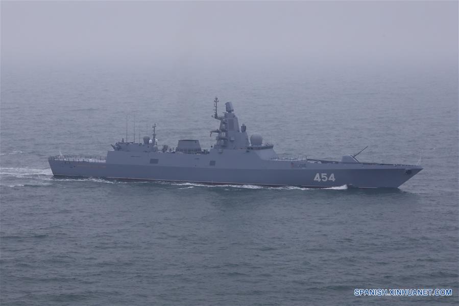 Vista aérea de la fragata Almirante Gorshkov de la Armada de Rusia en aguas de la costa de Qingdao, provincia de Shandong, en el este de China, el 23 de abril de 2019. El buque estuvo en el lugar el martes para participar en un desfile naval con motivo del 70 aniversario de la fundación de la Armada del Ejército Popular de Liberación (EPL) de China. (Xinhua/Ju Zhenhua)