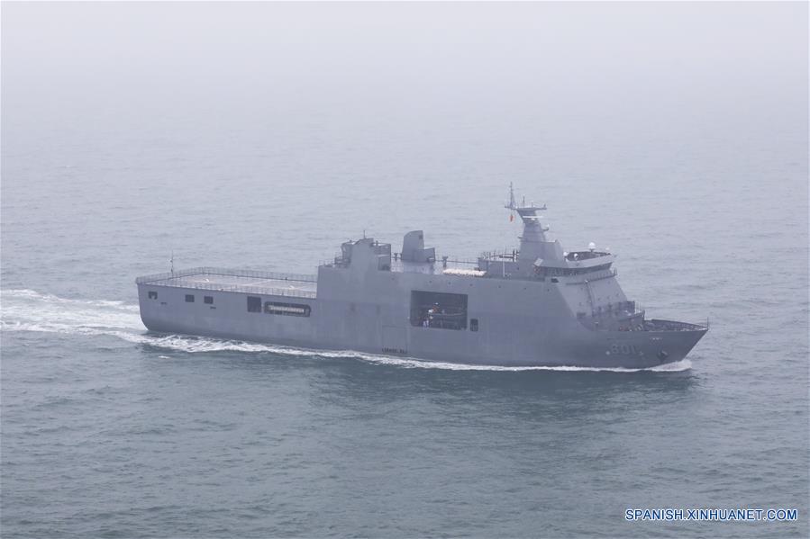 Vista aérea del buque BRP Tarlac de la Armada de Filipinas en aguas de la costa de Qingdao, provincia de Shandong, en el este de China, el 23 de abril de 2019. El buque estuvo en el lugar el martes para participar en un desfile naval con motivo del 70 aniversario de la fundación de la Armada del Ejército Popular de Liberación (EPL) de China. (Xinhua/Ju Zhenhua)