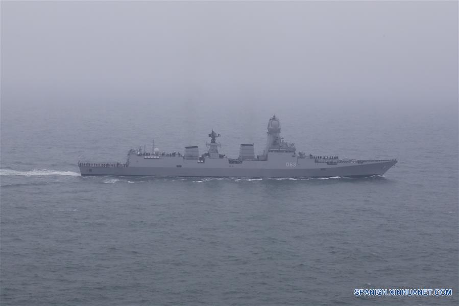 Vista aérea del destructor INS Kolkata de la Armada de India en aguas de la costa de Qingdao, provincia de Shandong, en el este de China, el 23 de abril de 2019. El buque estuvo en el lugar el martes para participar en un desfile naval con motivo del 70 aniversario de la fundación de la Armada del Ejército Popular de Liberación (EPL) de China. (Xinhua/Ju Zhenhua)