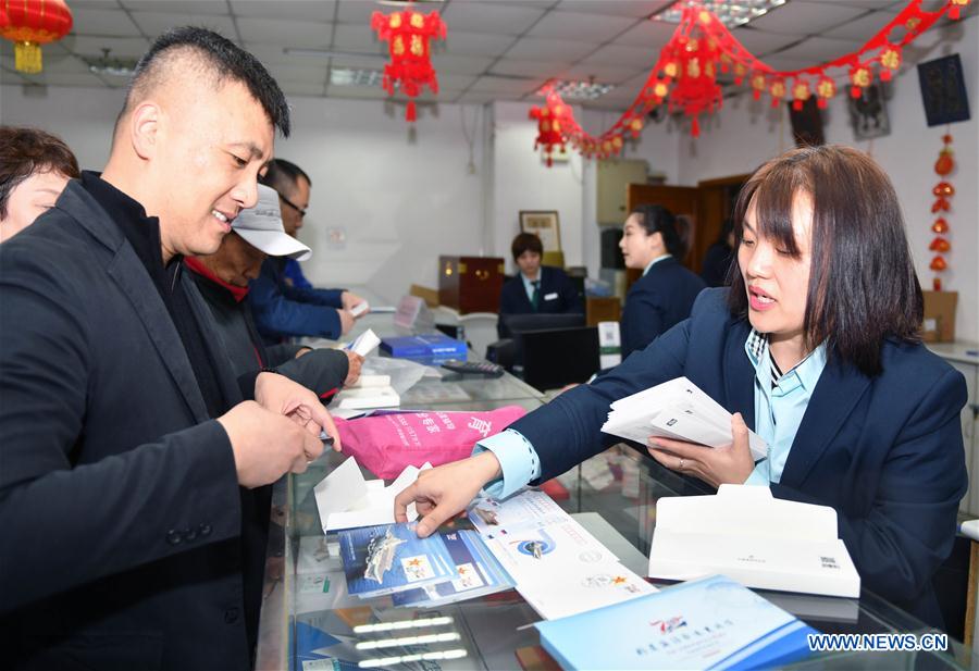 Beijing, 24/04/2019 (El Pueblo en Línea) - Venta de sobres conmemorativos en una tienda de Qingdao, provincia de Shandong, 23 de abril del 2019. Este martes se emitió un conjunto de artículos filatélicos que conmemoran el 70 aniversario de la fundación de la Armada del Ejército Popular de Liberación de China (PLA, por sus siglas en inglés). (Foto: Xinhua/ Zhu Zheng)