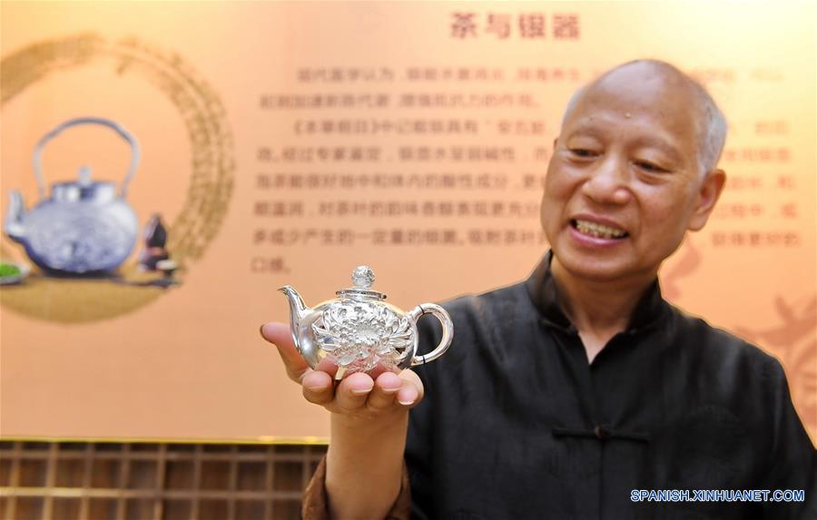 FUJIAN, 25 abril, 2019 (Xinhua) -- Imagen del 24 de abril de 2019 de Lin Shiyuan, un heredero de artesanías de plata del grupo étnico She, mostrando una tetera de plata, en Fuzhou, provincia de Fujian, en el sureste de China. Una feria de talla de plata del grupo étnico She fue llevada a cabo el miércoles en Fuzhou. (Xinhua/Lin Shanchuan)
