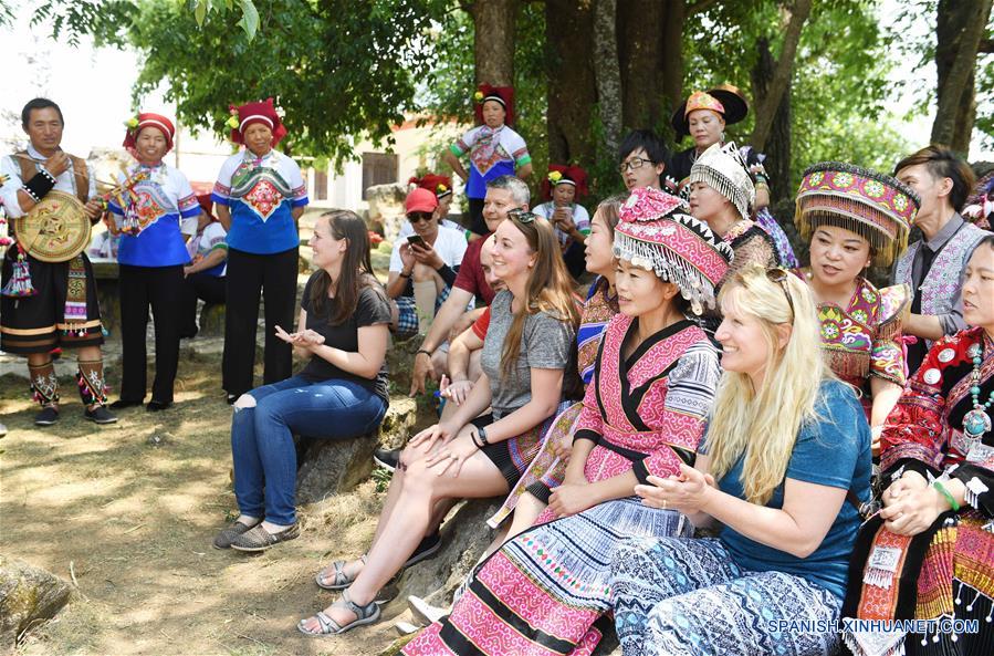 Imagen del 25 de abril de 2019 de personas de grupos étnicos y turistas estadounidenses asistiendo a un evento cultural, en la villa de Heiyudong del distrito de Yanshan, provincia de Yunnan, en el suroeste de China. Un evento cultural fue llevado a cabo en el distrito de Yanshan, donde personas de grupos étnicos incluyendo Han, Zhuang, Miao, Yi y turistas extranjeros intercambiaron diferentes costumbres y artes populares. (Xinhua/Yang Zongyou)