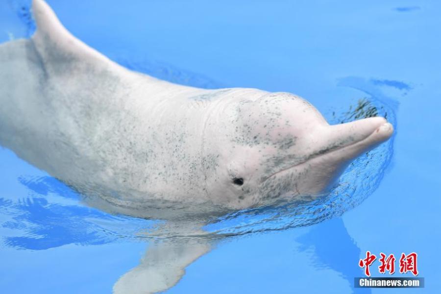 Un delfín blanco chino actúa durante un evento en el Reino del Océano Chimelong en Zhuhai, provincia de Guangdong, el 27 de abril del 2019. Aclamado como las "sirenas" o “pandas gigantes del mar,", los delfines blancos chinos a menudo se avistan en el Mar Oriental de China. Estas criaturas están bajo la protección estatal de primera clase. El evento forma parte de una campa?a anual de conservación destinada a concienciar sobre el cuidado que hay que brindarle a este especie, que se encuentra en peligro de extinción. (Foto: SNC)