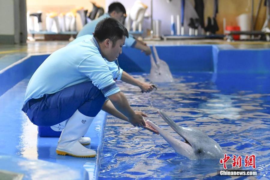 Delfines blancos chinos actuan durante un evento en el Reino del Océano Chimelong en Zhuhai, provincia de Guangdong, el 27 de abril del 2019. Aclamado como las "sirenas" o “pandas gigantes del mar,", los delfines blancos chinos a menudo se avistan en el Mar Oriental de China. Estas criaturas están bajo la protección estatal de primera clase. El evento forma parte de una campa?a anual de conservación destinada a concienciar sobre el cuidado que hay que brindarle a este especie, que se encuentra en peligro de extinción. (Foto: SNC)