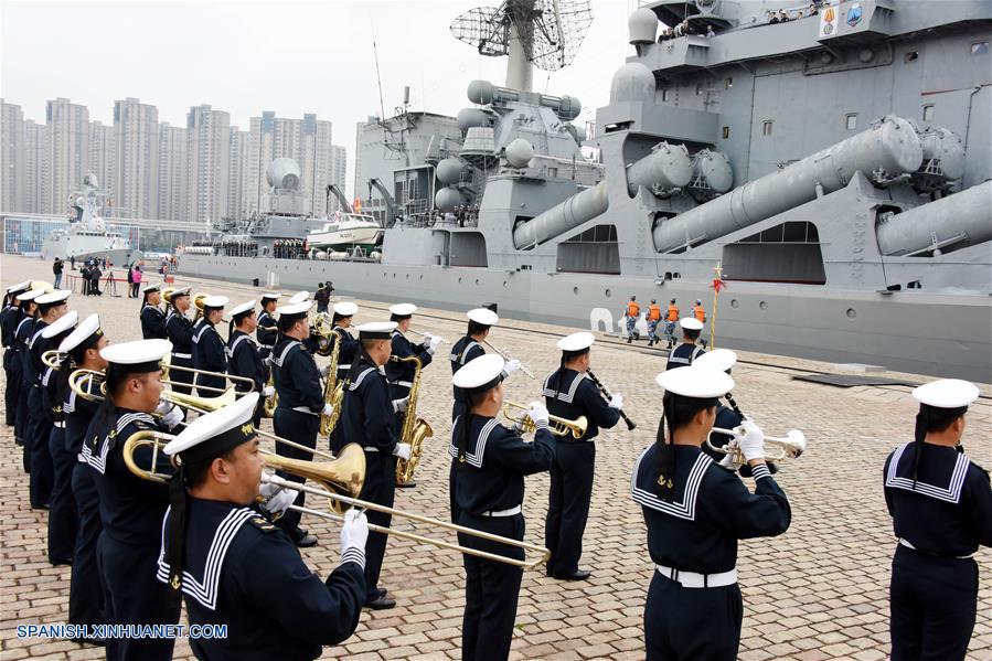 QINGDAO, 29 abril, 2019 (Xinhua) -- La banda militar de la Armada del Ejército Popular de Liberación de China (EPL), tocan música para dar la bienvenida al crucero ruso Varyag en el puerto de Dagang en Qingdao, provincia de Shandong, en el este de China, el 29 de abril de 2019. Embarcaciones de la Armada de Rusia llegaron el lunes a Qingdao, en la provincia de Shandong, para participar en el ejercicio "Mar Conjunto 2019" chino-ruso. El ejercicio busca consolidar y desarrollar la asociación estratégica integral de coordinación entre China y Rusia, profundizar la cooperación pragmática naval y mejorar sus capacidades para responder en conjunto a las amenazas contra la seguridad en el mar. En el ejercicio participarán dos submarinos, 13 barcos, así como aviones de ala fija, helicópteros y marinos. (Xinhua/Li Ziheng)