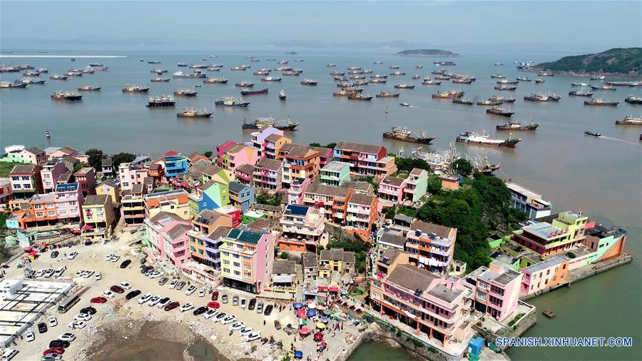 ZHEJIANG, 4 mayo, 2019 (Xinhua) -- Vista aérea de botes pesqueros anclados de la aldea Xiaoruo en la ciudad de Wenling, en la provincia de Zhejiang, en el este de China, el 4 de mayo de 2019. (Xinhua/Wang Huabin)