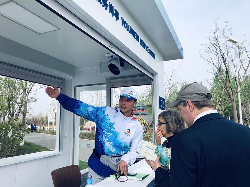 Xu Qing, asiste a dos visitantes extranjeros en la Exposición de Horticultura de Beijing, 29 de abril del 2019. [Foto: Jin Dan/ Chinadaily. com. cn]